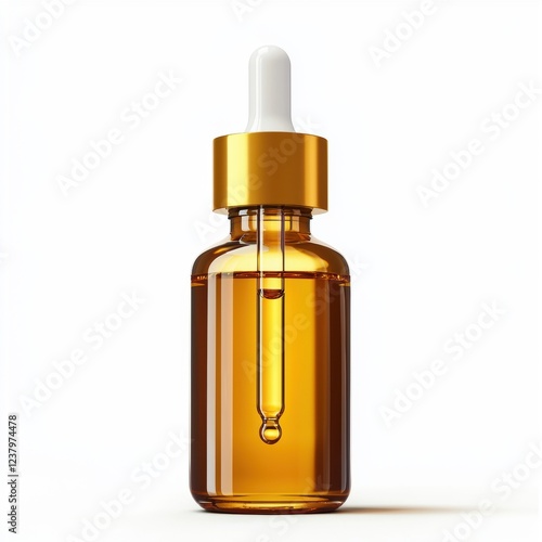 Bottle of luxurious hair oil with a dropper dripping golden liquid, isolated on a clean white background