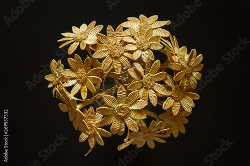 Bouquet of flowers made of straw on a dark background. View from the top