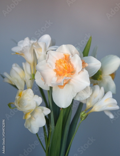 Bouquet of white Freesia and narcissus, in bloom, on grey background