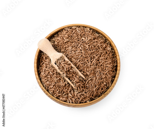 Bowl and scoop of aromatic caraway (Persian cumin) seeds isolated on white, top view