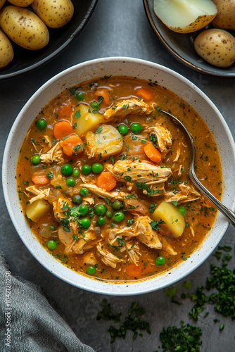 bowl of chicken and potato stew with carrots, vegetables, and herbs on the side