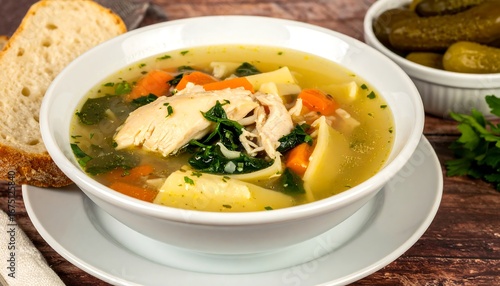 Bowl of chicken noodle soup with fresh vegetables