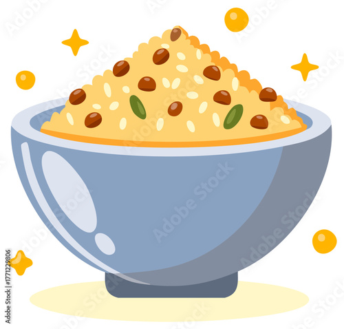 Bowl of delicious food. Cartoon illustration of a bowl with rice and toppings. Decorative elements.