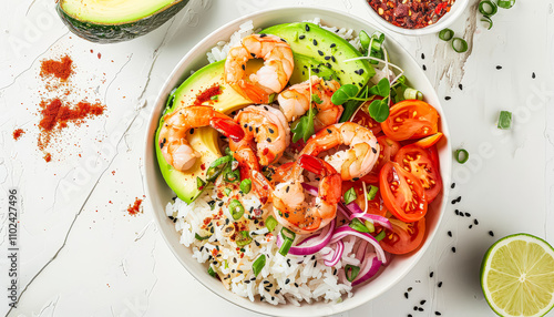 Bowl of food with shrimp, avocado, and radishes. The bowl is on a white background