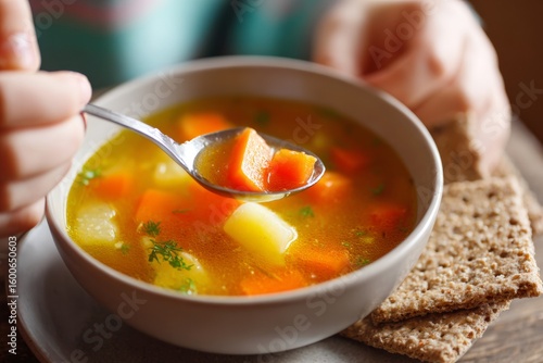 Bowl of homemade vegetable soup warmly lit on a table, as a child eagerly holds a spoon with vibrant vegetables, accompanied by whole grain crackers for a nutritious meal