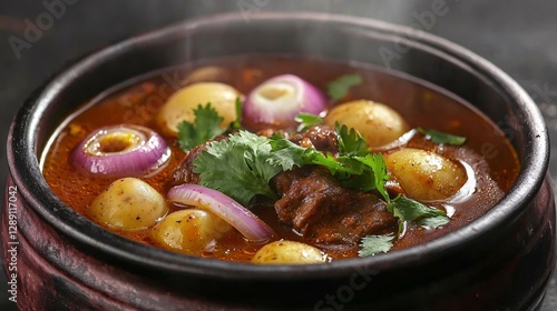 bowl of Massaman curry with tender beef, potatoes, and onions, garnished with cilantro, isolated on black. Massaman curry, beef, potatoes, onions, cilantro, Thai food, curry, isolated, black