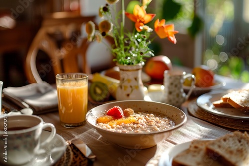 Bowl of oatmeal and fruit on a table. Morning porridge, food background