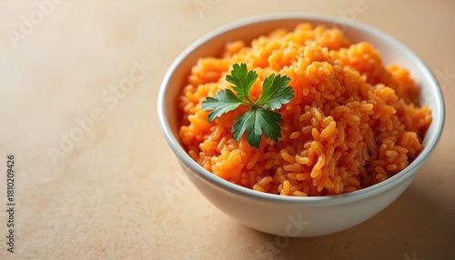 Bowl of rice on beige surface. Cooked grains shown with parsley garnish. Simple presentation of healthy carbs meal. Food stylist used studio lighting to showcase vegetarian cuisine.