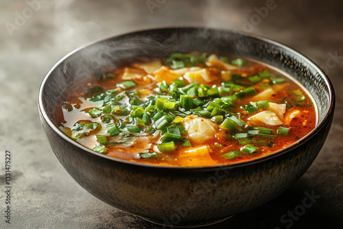 Bowl of soup with hearty chunks of meat and vibrant green onions, steaming and inviting.