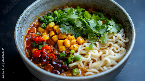 Bowl Of Spicy Noodle Soup With Corn And Vegetables