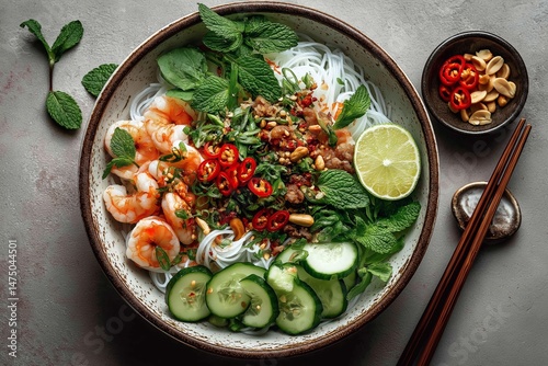 Bowl of Yum Woon Sen, Thai glass noodle salad with shrimp, cucumber, peanut sauce, mint leaves, red chili, lime. Concept of Yum Woon Sen, vibrant and colorful dish appealing to many.