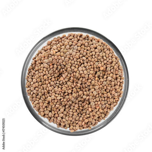 Bowl with healthy lentils, isolated on white