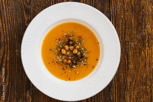 Bowl with vegan pumpkin and chickpea cream soup on wooden table, directly above
