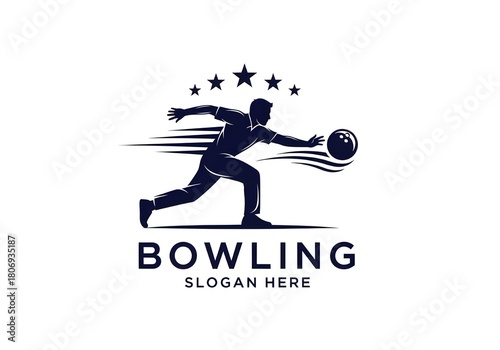 Bowling action logo silhouette with dynamic motion lines and stars, perfect for team branding, sports apparel, or bowling alley marketing designs