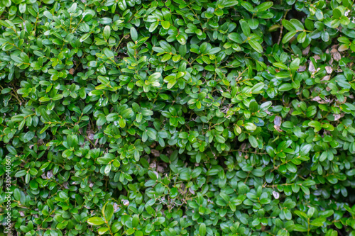 Boxwood or Buxus sempervirens bush in the garden, decorative plant, close-up texture of green leaves, evergreen shrub, natural pattern