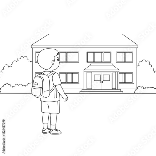 boy standing in front of school building with backpack looking optimistic