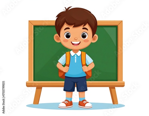 Boy with backpack in front of chalkboard