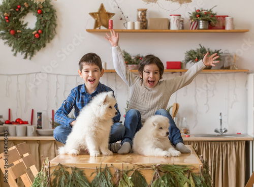 Boys brothers, home, samoyed puppy, fun