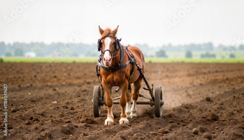 Brabant horse plowing farmland in overcast conditions, agricultural heritage