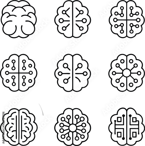Brain Technology Icon Set | AI Neural Network Circuit Brain Vector for Tech and Science