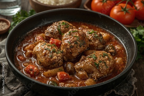 Braised poultry with vegetables and olives in a culinary dish
