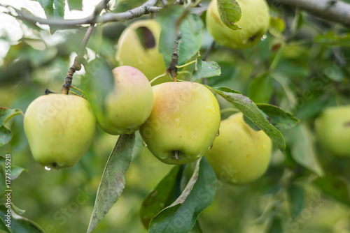 Branch of ripening green apples hanging on tree in orchard garden on green background