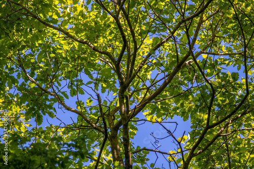 Branches of an oak tree against blue sky