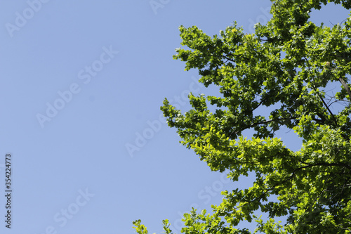 Branches with leaves on a blue sky background.