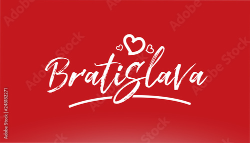 bratislava white city hand written text with heart logo on red background