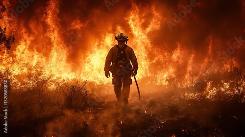 Bravely, a firefighter walks into the wildfire, hose in hand, showing courage and dedication amidst intense orange flames and smoke.