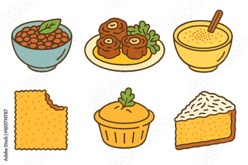 Brazilian cuisine illustrated in cartoon style with soft colors and no writing. Ideal for food UI kits, editorial stock or recipe visuals.