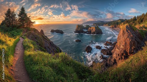 breathtaking panoramic view of cliffside trail overlooking ocean, showcasing vibrant sunset colors and lush greenery