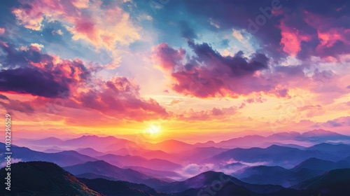 Breathtaking Sunset Over Scenic Mountain Landscape with Dramatic Clouds