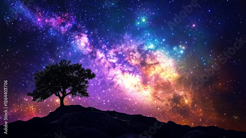 Breathtaking view of a lone tree silhouetted against a dazzling night sky filled with the Milky Way and colorful cosmic nebulae. Image made using Generative AI.