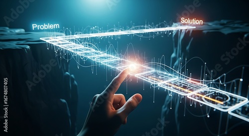 Bridge building and problem-solving concept. A hand completes the final segment of a holographic light bridge connecting "Problem" to "Solution."