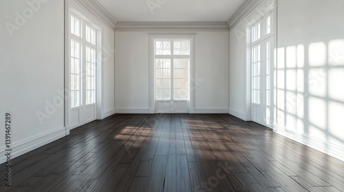 Bright and airy empty room with hardwood floors and classic white walls. Ideal for real estate listings or interior design mockup purposes.