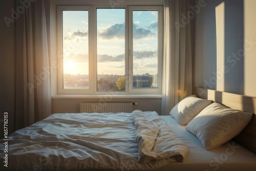 Bright and cozy bedroom with plants and morning sunlight streaming through the windows