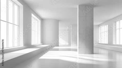 Bright and spacious white interior room with large windows and concrete pillars