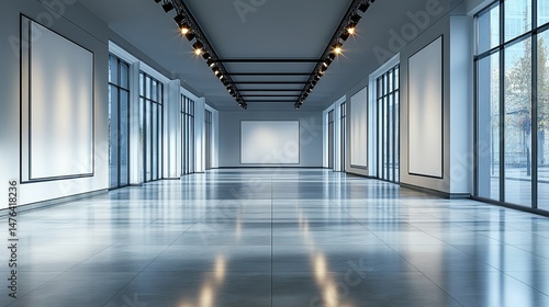 Bright art gallery interior with blank canvas frames and track lighting on the ceiling in perspective