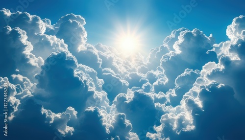 Bright blue sky with fluffy white clouds and sunlight with copy space for outdoor and nature themes