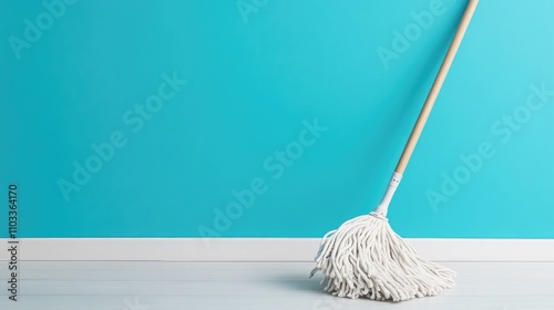 Bright Blue Wall with Clean White Mop on Light Floor, Symbolizing Tidiness and Freshness in Interior Spaces and Cleaning Environments