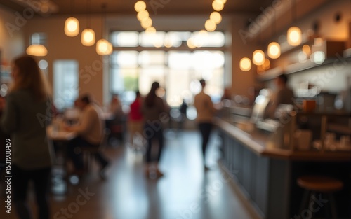 Bright Blur coffee shop with people in walking in blurred motion in coffee shop space. High quality