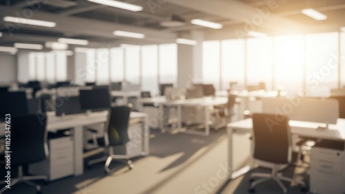 Bright blurred modern office interior with warm sunlight streaming through large windows an empty corporate workplace