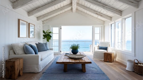 Bright Coastal Lounge with Blue Accents and Jute Rug