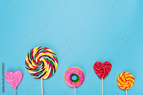 Bright colored lollipops on a stick on a blue background. Hearts, circle and doughnut.