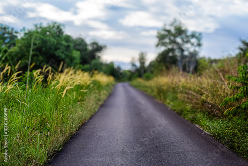 Bright day light on the pine forest road with long grass. Magical forest in the morning and evening