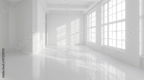 Bright empty white room with large windows casting shadows on the floor. Modern interior design and architecture.
