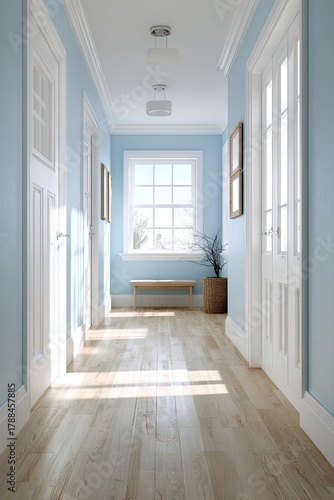 Bright hallway with natural light and wooden floor interior design concept