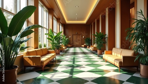 Bright hotel hallway features green checkered floor and yellow sofas. Large plants sit near tall windows, bringing nature inside modern lobby space. Sunlight streams through.