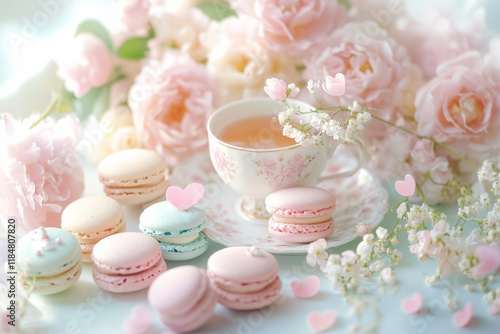 Bright pastel macarons arranged with delicate floral elements and a cup of tea at a cozy setting